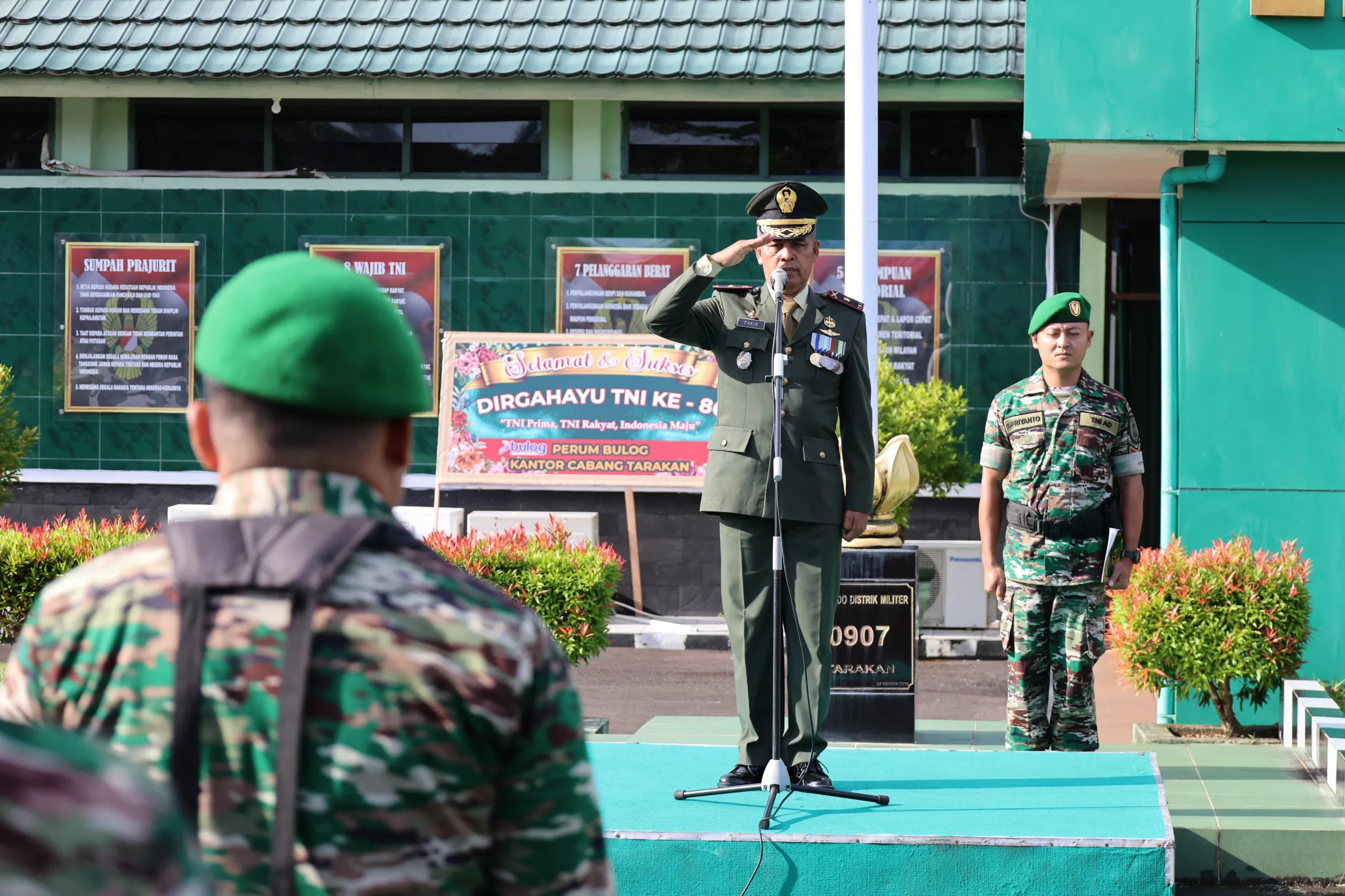 Tarakan – Dalam rangka memperingati Hari Ulang Tahun (HUT) ke-80 Tentara Nasional Indonesia (TNI), Komando Distrik Militer (Kodim) 0907/Trk menggelar upacara peringatan di Lapangan Upacara Makodim,JL.P.Kalimantan RT.17 Kel.Kampung 1 Skip,Kec.Tarakan Tengah,Minggu(05/10/2025).