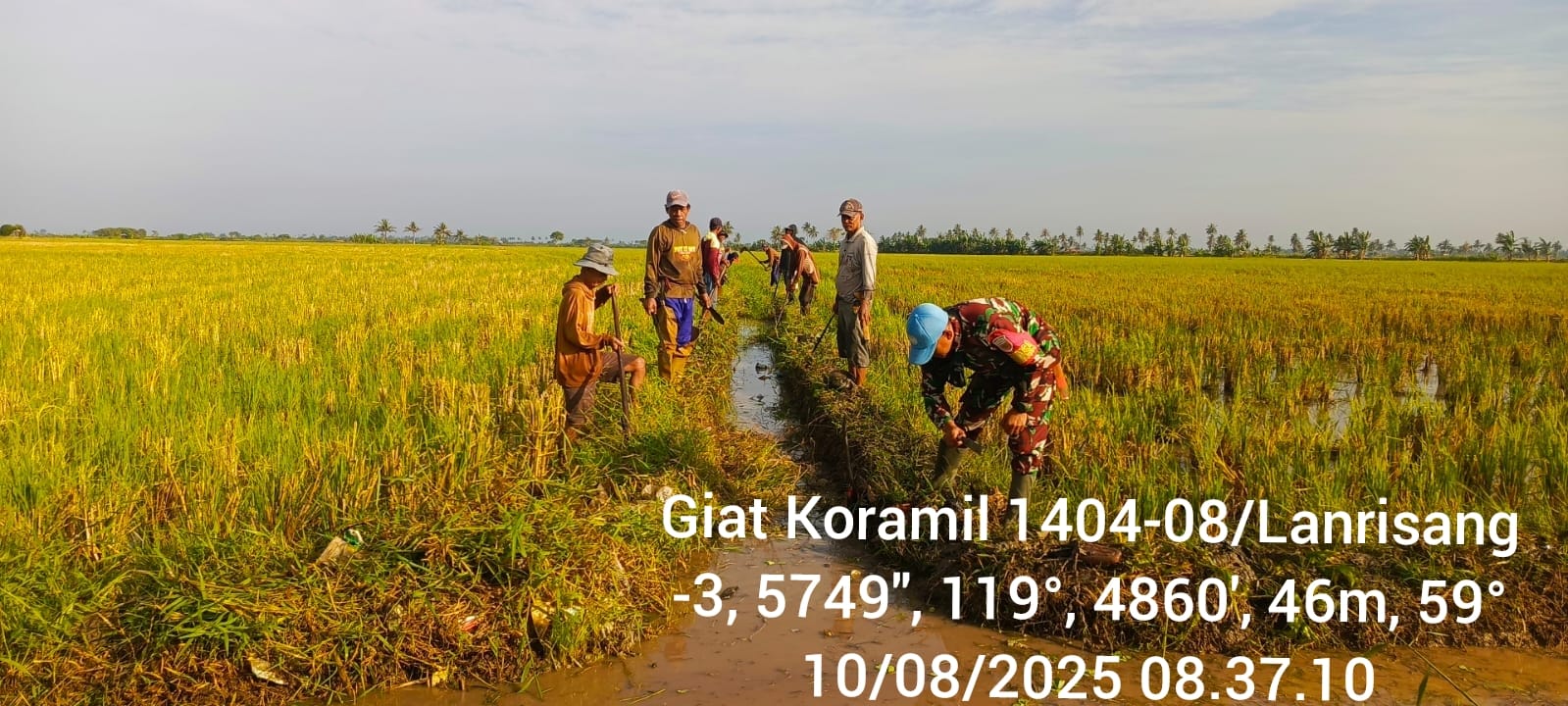 Pinrang_ Untuk memenuhi kebutuhan air persawahan, Babinsa jajaran Koramil-08/Lanrisang Kodim 1404/Pinrang melaksanakan kerja bakti bersama warga pembersihan saluran irigasi guna mendukung proses persiapan turun sawah memasuki musim tanam di Lingkungan Kassi kelurahan Lanrisang Kecamatan Lanrisang Kabupaten Pinrang, Minggu (10/08/2025).