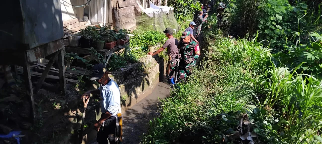 Enrekang _ Anggota Koramil 1419-03/Baraka Kodim 1419/Enrekang yang dipimpin oleh Peltu Arsyad bersama masyarakat Melaksanakan karya bakti pembersihan dreinase dari tanah, rumput dan sampah lainnya sepanjang 150 meter di Kel. Baraka Kec. Baraka Kab. Enrekang, Selasa (28/10/2025).