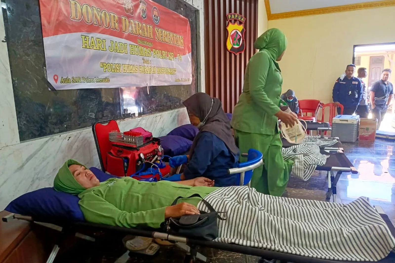 Dalam rangka memperingati Hari Jadi Humas Polri ke-74 Tahun 2025 dengan tema ”Polisi Humas Harapan Masyarakat”, puluhan Prajurit TNI dan Persit Kartika Chandra Kirana Cabang XVIII Kodim 1707/Merauke turut ambil bagian dalam kegiatan donor darah serentak yang digelar di Aula Sarja Arya Racana Polres Merauke, Jalan Brawijaya, Kabupaten Merauke – Provinsi Papua Selatan. Rabu (22/10/2025).