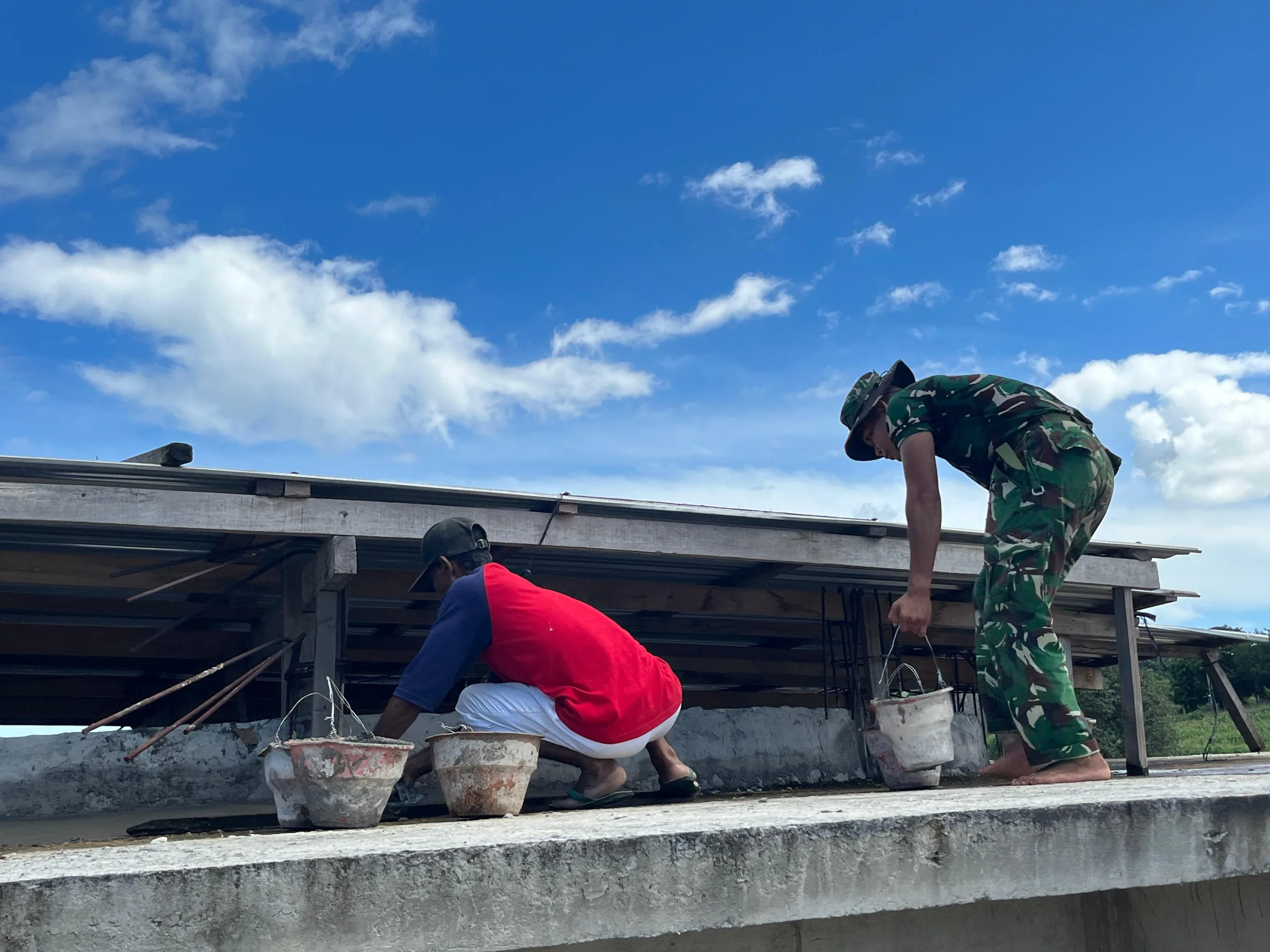 Dalam proses pengerjaan, para prajurit membagi tugas mulai dari pengadukan material, pengangkutan semen, pemasangan rangka baja ringan hingga penataan atap. Kerja sama yang solid membuat proses pengecoran berjalan cepat dan rapi, sekaligus memastikan struktur bangunan memiliki kualitas yang kuat dan aman.