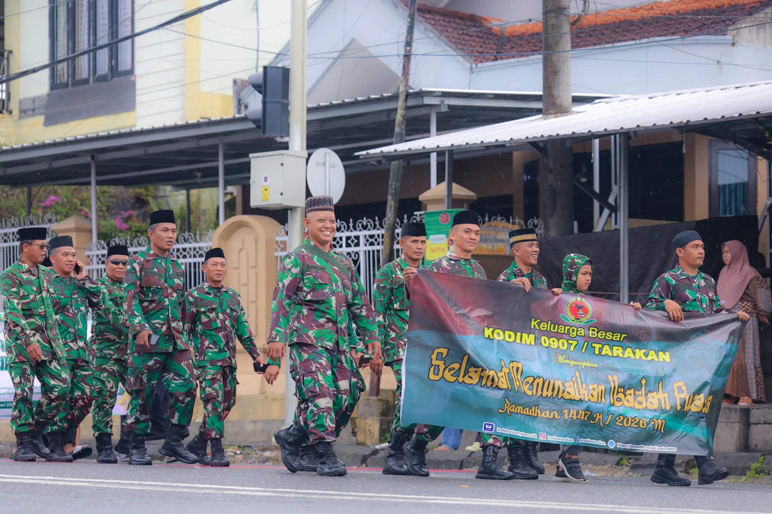 Tarakan – Prajurit Kodim 0907/Trk dan Ribuan warga,Unsur TNI – POLRI,ASN,serta pelajar, memeriahkan Kirab Ta’aruf Ramadan 1447 H (2026) untuk menyambut bulan suci dengan pawai keliling di Kota Tarakan.