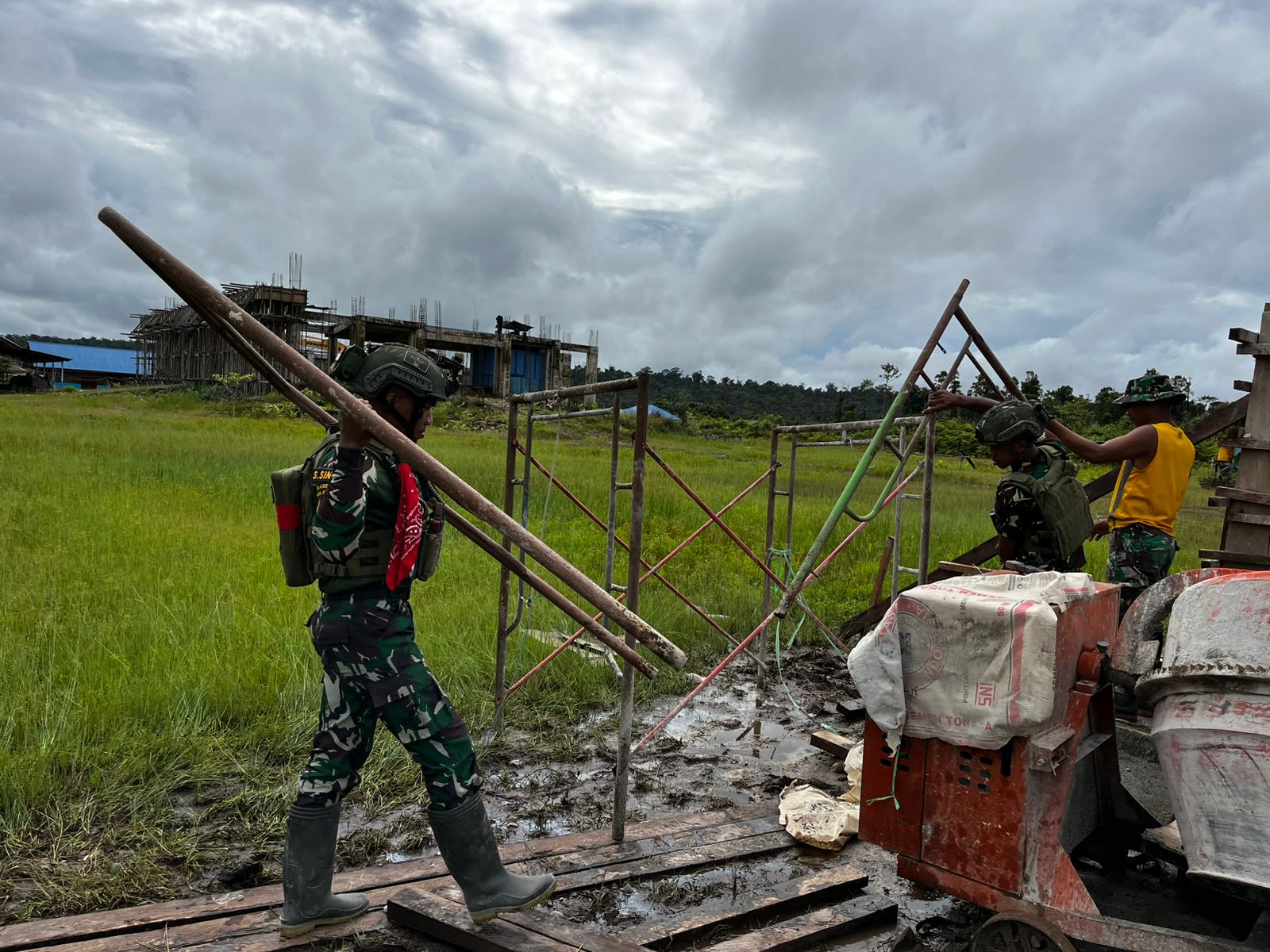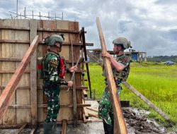 Dengan peralatan sederhana, namun penuh semangat gotong royong, para prajurit dan warga bahu membahu memastikan setiap rangka terpasang dengan kokoh dan presisi.