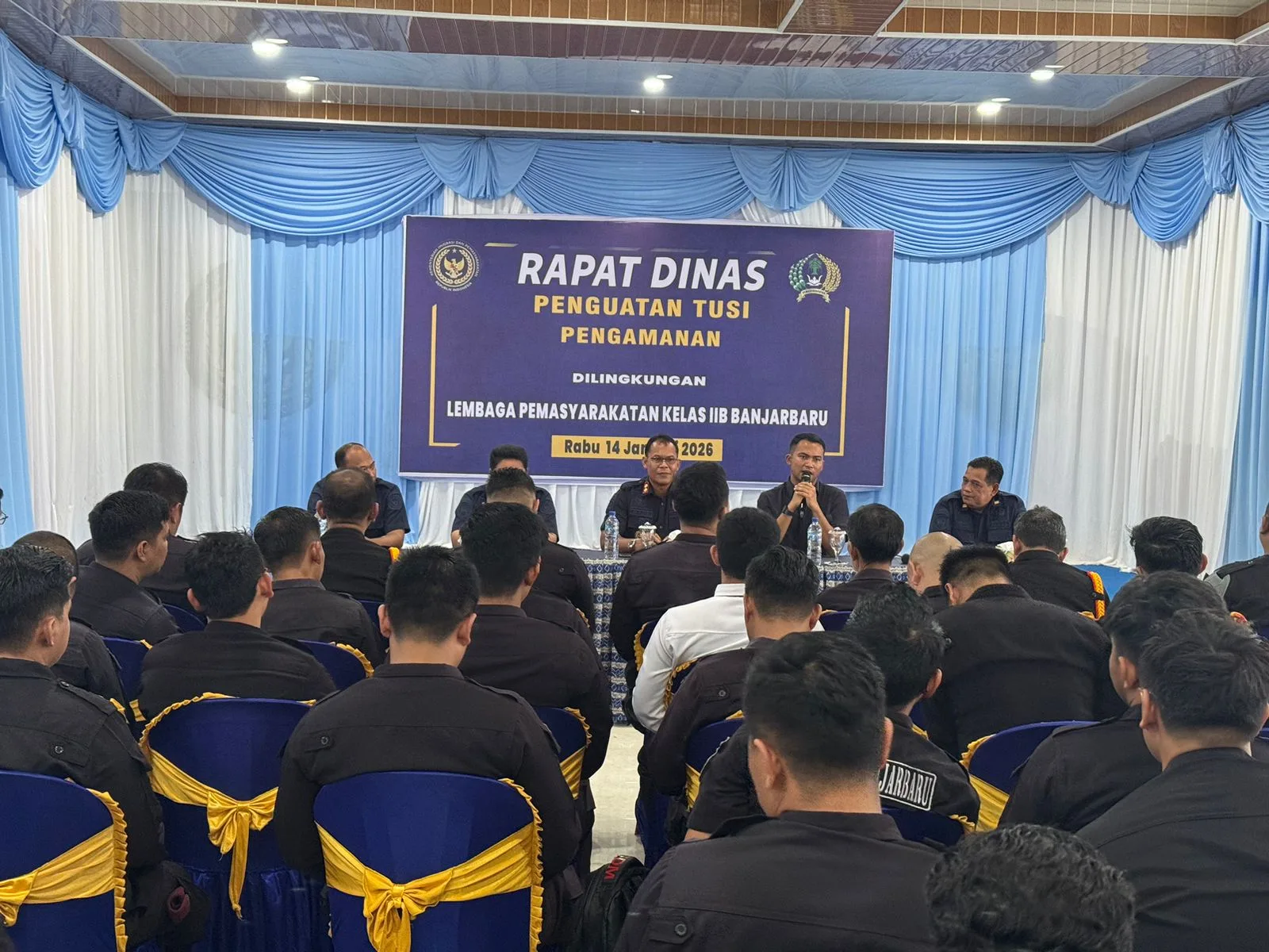Banjarbaru, INFO_PAS – Lembaga Pemasyarakatan melaksanakan Rapat Penguatan Tugas dan Fungsi Pengamanan yang dipimpin langsung oleh Kepala Kesatuan Pengamanan Lembaga Pemasyarakatan (Ka. KPLP), Jagad Agus Nugroho, bertempat di aula Lapas, Rabu (14/1). Rapat ini bertujuan untuk meningkatkan pemahaman serta pelaksanaan tugas pengamanan yang profesional, humanis, dan sesuai dengan Standar Operasional Prosedur (SOP).
