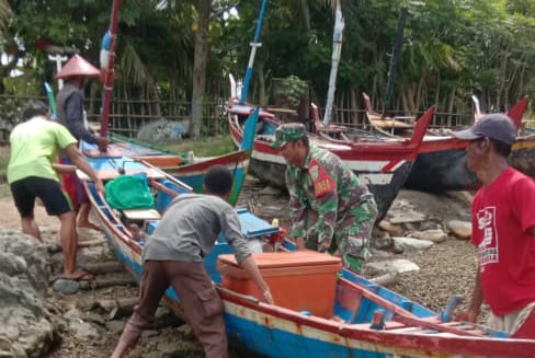 Babinsa Serda Andrian terlihat turun langsung ke lokasi pendaratan perahu nelayan di desa binaannya membantu mengangkat hasil tangkapan serta memastikan proses berlangsung aman dan lancar.