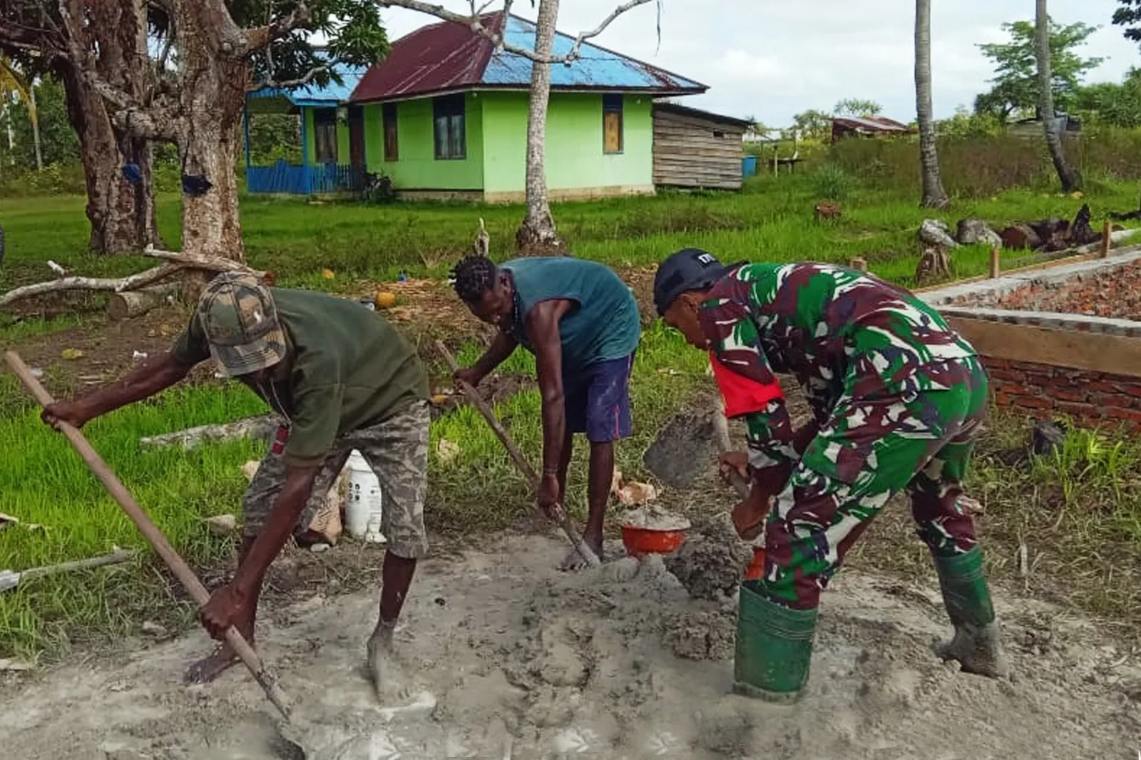 ”Kegiatan kerja bakti tersebut bertujuan membantu meringankan beban keluarga Bapak Felikus Kumuye dalam membangun rumah. Saat ini pembangunannya masih pada tahap pengecoran dan pemasangan batu bata sebagai pondasi”. ujar Kapten Inf Latupono.