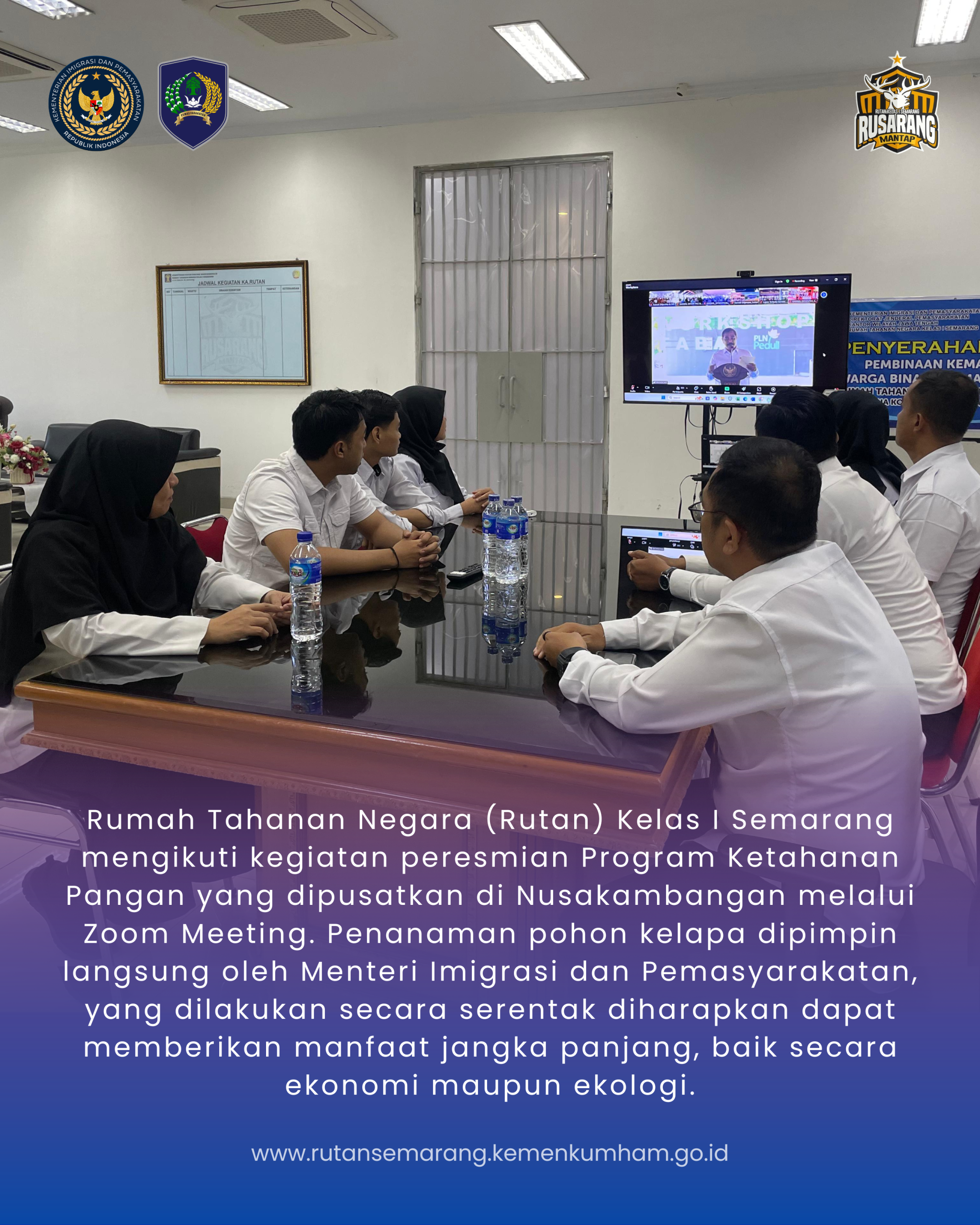 Semarang, 9 September 2025 – Rumah Tahanan Negara (Rutan) Kelas I Semarang mengikuti kegiatan peresmian Program Ketahanan Pangan yang dipusatkan di Nusakambangan melalui Zoom Meeting, Selasa (9/9). Kegiatan ini dirangkaikan dengan penanaman pohon kelapa secara serentak di seluruh wilayah Indonesia, yang dipimpin langsung oleh Menteri Imigrasi dan Pemasyarakatan.