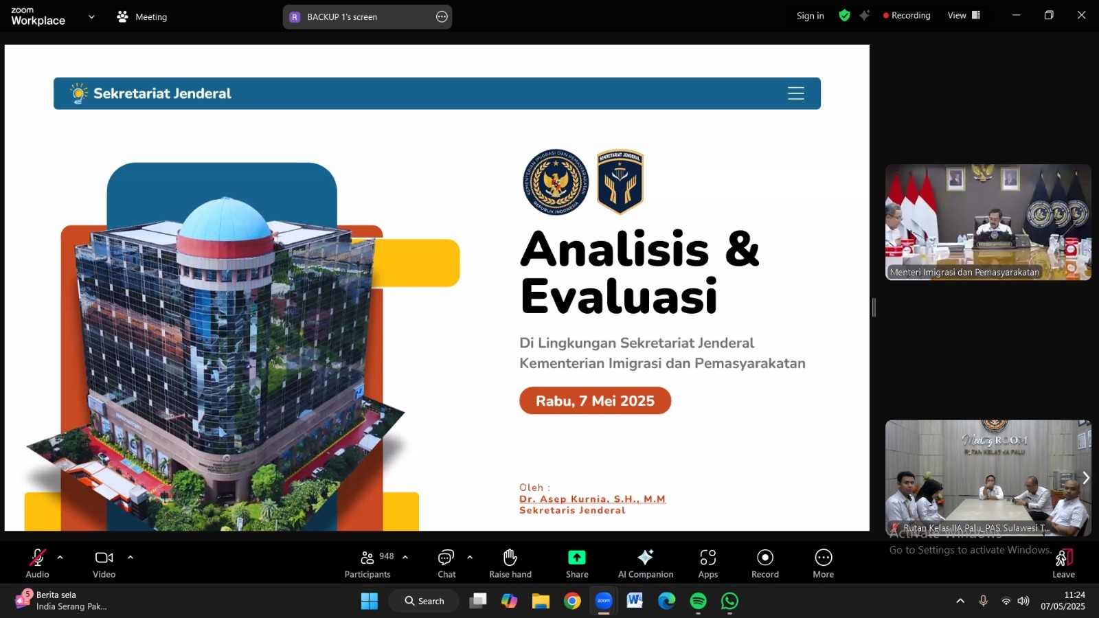 Palu, INFO_PAS– Rumah Tahanan Negara (Rutan) Kelas IIA Palu mengikuti Rapat Analisis dan Evaluasi (Anev) Kinerja Kementerian Imigrasi dan Pemasyarakatan secara virtual langsung bersama Menteri Imipas RI, Agus Andrianto, Rabu (07/05/2025).