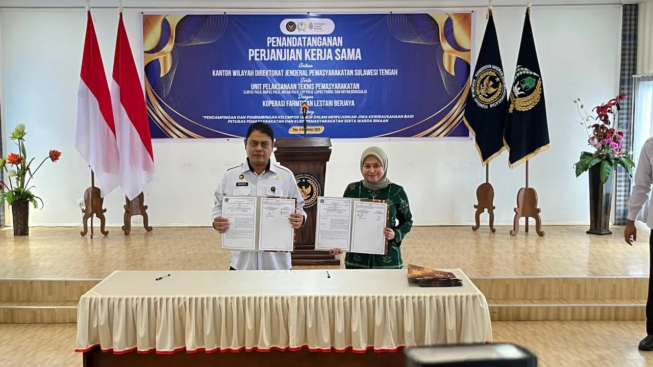 Palu, INFO_PAS– Melalui kegiatan Penandatanganan Perjanjian Kerja Sama (PKS) antara Kanwil Ditjenpas Sulawesi Tengah bersama UPT Pemasrakatan dengan Koperasi Farmatisan Lestari Berjaya, Rumah Tahanan Negara (Rutan) Kelas IIA Palu turut mengambil langkah maju dalam upaya pembinaan kemandirian mereka dengan ikut menandatangani Perjanjian tersebut, Kamis (6/11/2025).
