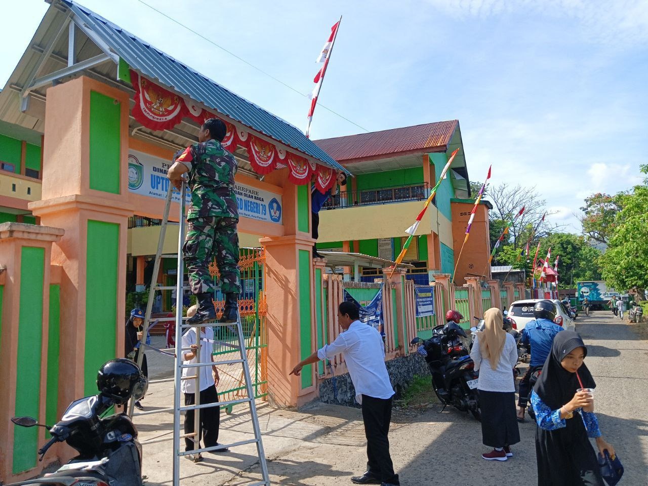 KODIM 1405/PAREPARE – Babinsa (Bintara Pembina Desa) Koramil 1405-03/Bacukiki, Serda Ridwan membantu guru memasang umbul-umbul dalam rangka memeriahkan HUT ke-80 Kemerdekaan Republik Indonesia bertempat UPTD SD negeri 79 Parepare Kelurahan Sumpang Minagae Kecamtan Bacukiki Barat Kota Parepare. Jum’at (08/08/2025)