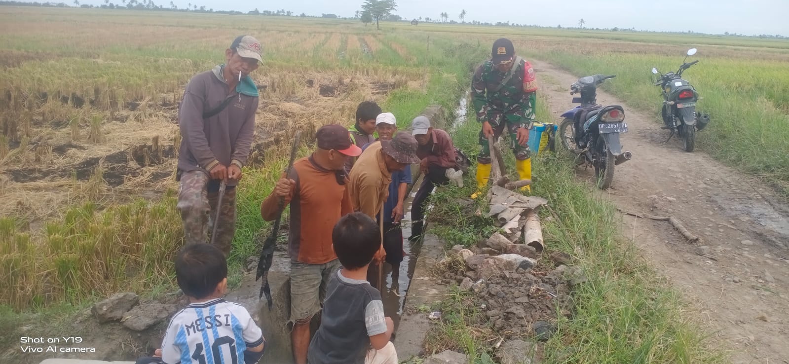 Pinrang_ Sambut musim tanam Apri-September 2025, Babinsa Koramil-02/Mattiro Sompe Kodim 1404/Pinrang Serka Mustaming bersama PPL dan masyarakat bergotong-royong membersihkan saluran irigasi di Dusun Patobong Desa Patobong Kecamatan Mattiro Sompe Kabupaten Pinrang, Jum’at (23/05/2025).