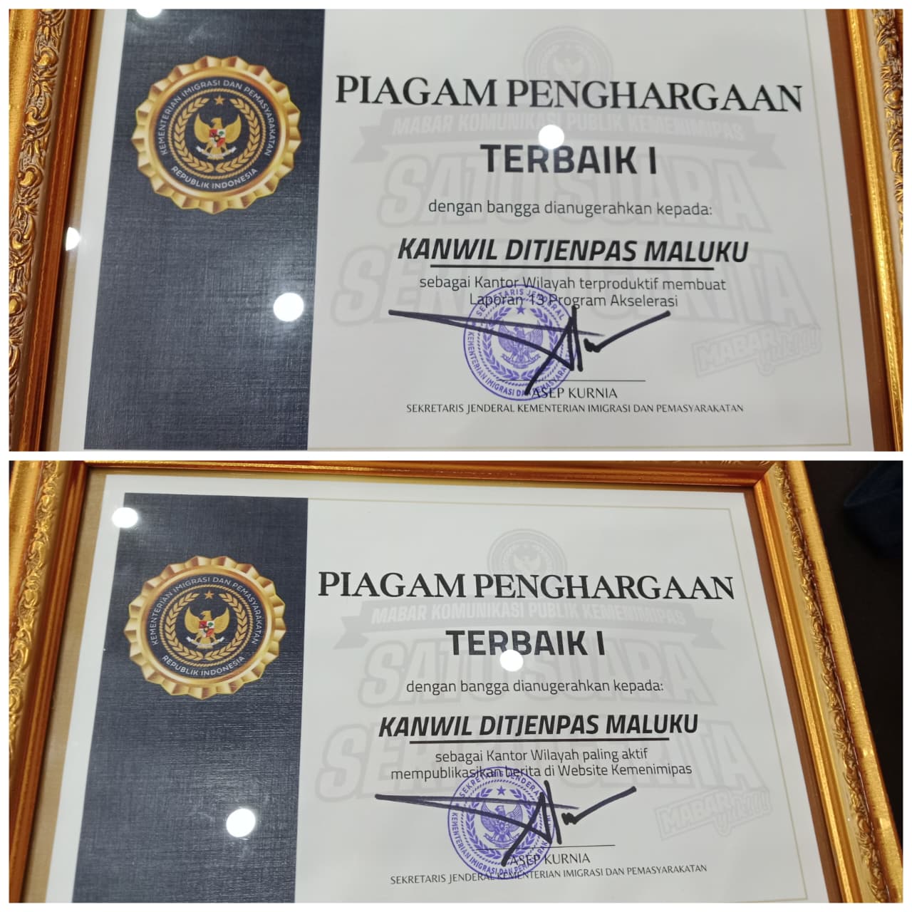 Kegiatan tersebut. Penghargaan pertama diberikan sebagai Terbaik I Kantor Wilayah terproduktif membuat laporan 13 Program Akselerasi, sementara penghargaan kedua sebagai Terbaik I Kantor Wilayah paling aktif mempublikasikan berita di website Kemenimipas.