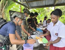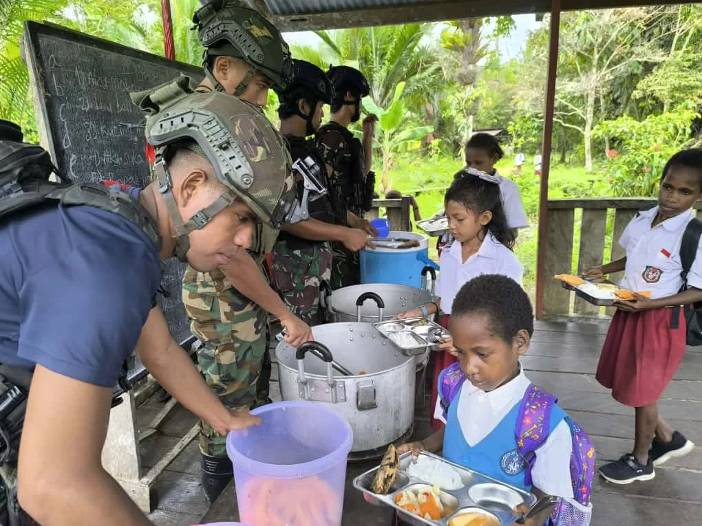 Papua, 11 November 2025 — Di tengah hijaunya pepohonan dan suara riang anak-anak di SD Rimba YPPK Yan Smith Mumugu 2, tampak sekelompok prajurit berseragam loreng sibuk menata piring-piring berisi makanan bergizi. Aroma nasi hangat dan lauk pauk bergizi memenuhi udara pagi itu. Mereka bukan sekadar tentara penjaga perbatasan, tetapi juga sosok saudara yang membawa kepedulian dan kasih, inilah Satgas Pamtas Mobile Yonif 733/Masariku dengan program andalan mereka, “Masariku Peduli Gizi.”