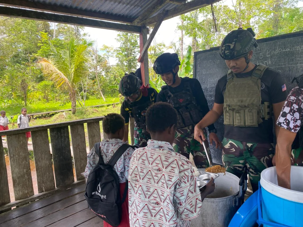 Sejak pagi hari personel Satgas menyiapkan hidangan bergizi seperti nasi, lauk pauk, sayur, dan susu. Kehangatan suasana terasa saat anak-anak duduk rapi, menyambut makanan dengan mata berbinar. Bukan hanya perut yang kenyang, tapi juga hati yang tersentuh oleh perhatian para prajurit.