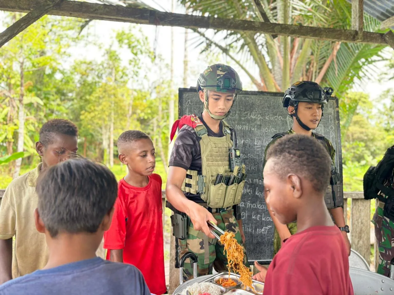Melalui kegiatan tersebut, para prajurit membagikan makanan bergizi lengkap dengan lauk pauk sehat kepada siswa-siswi sekolah dasar. Kegiatan ini disambut dengan antusias dan keceriaan oleh para siswa yang tampak bersemangat menikmati hidangan yang disiapkan oleh Satgas.