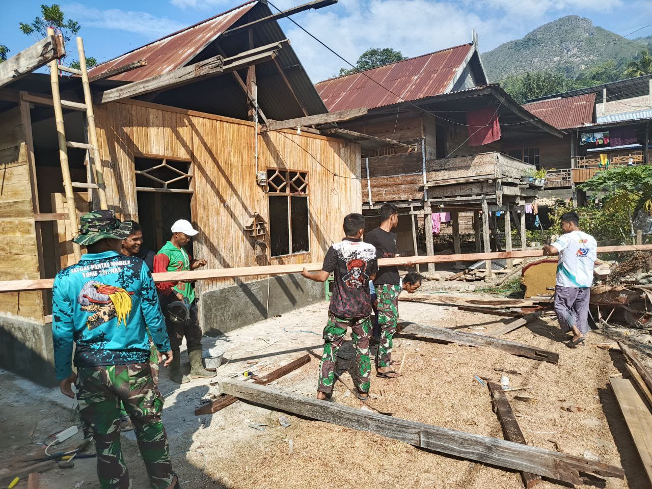 Personel Satgas bersama warga setempat melanjutkan proses pekerjaan RTLH yang kini memasuki 60% tahapan penyesuaian struktur dan pemasangan Atap.