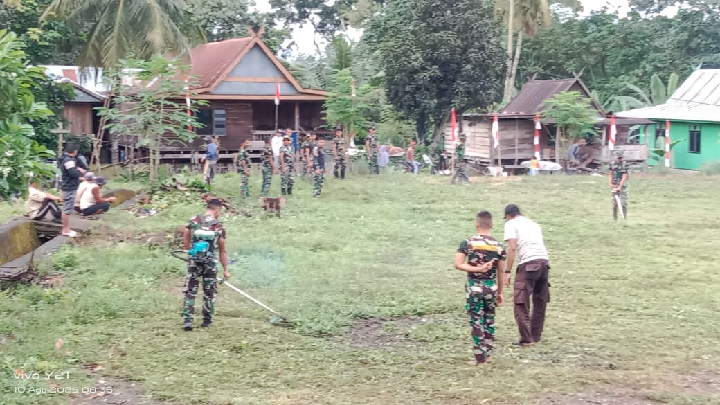 Maros – Bersama Masyarakat, Anggota Satgas TMMD ke-125 Kodim 1422/Maros secara gotong royong membersihkan lapangan sepakbola pangisoreng di Dusun Pangisoreng Desa Batu Putih Kecamatan Mallaawa, Kabupaten Maros, Minggu (10/8/25).