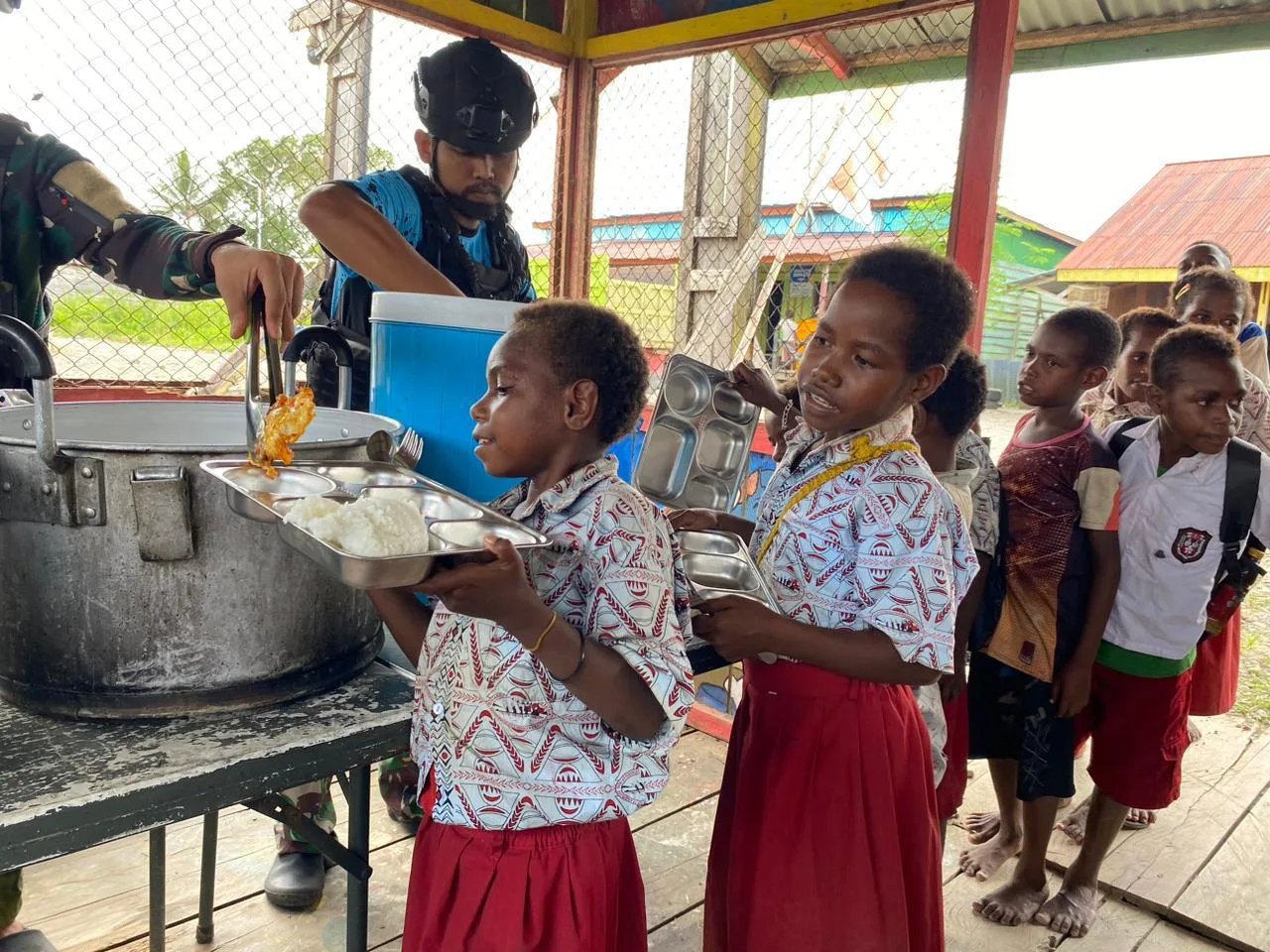 Dalam kegiatan tersebut, personel Satgas menyajikan makanan bergizi lengkap kepada siswa, mulai dari karbohidrat, sayuran, hingga lauk pauk berprotein tinggi. Kegiatan ini dirancang untuk membantu memperbaiki kualitas gizi anak-anak yang hidup di wilayah dengan akses pangan terbatas.