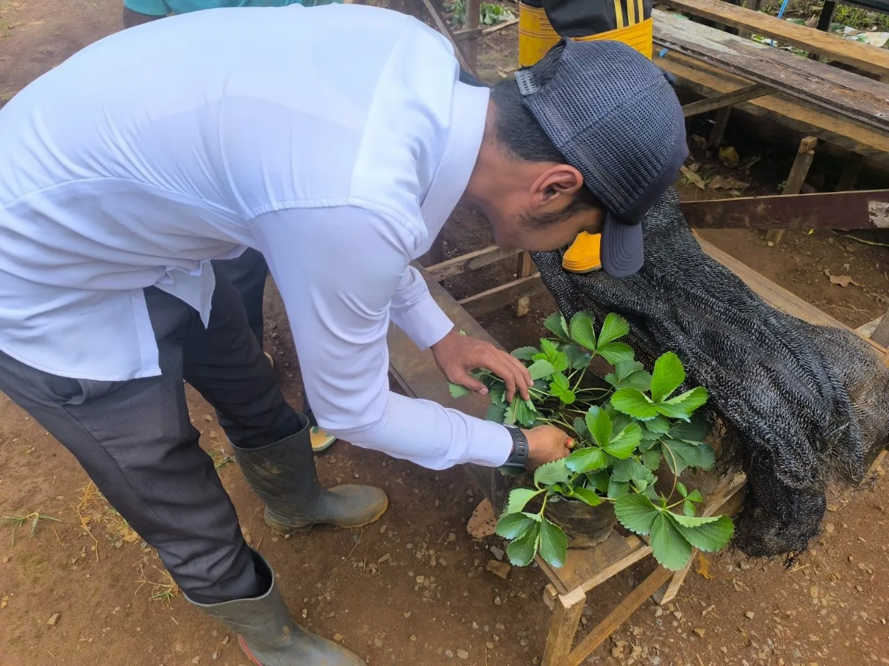 “Kami mulai dari menyiapkan tanah, mencampur dengan pupuk, lalu mengisi ke polybag satu per satu. Harapannya bibit stroberi nanti bisa tumbuh subur dan jadi tambahan tanaman di lahan SAE,” jelas Edy.