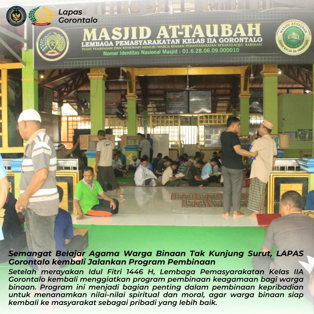 Gorontalo – Setelah merayakan Idul Fitri 1446 H, Lembaga Pemasyarakatan Kelas IIA Gorontalo kembali menggiatkan program pembinaan keagamaan bagi warga binaan. Program ini menjadi bagian penting dalam pembinaan kepribadian untuk menanamkan nilai-nilai spiritual dan moral, agar warga binaan siap kembali ke masyarakat sebagai pribadi yang lebih baik.