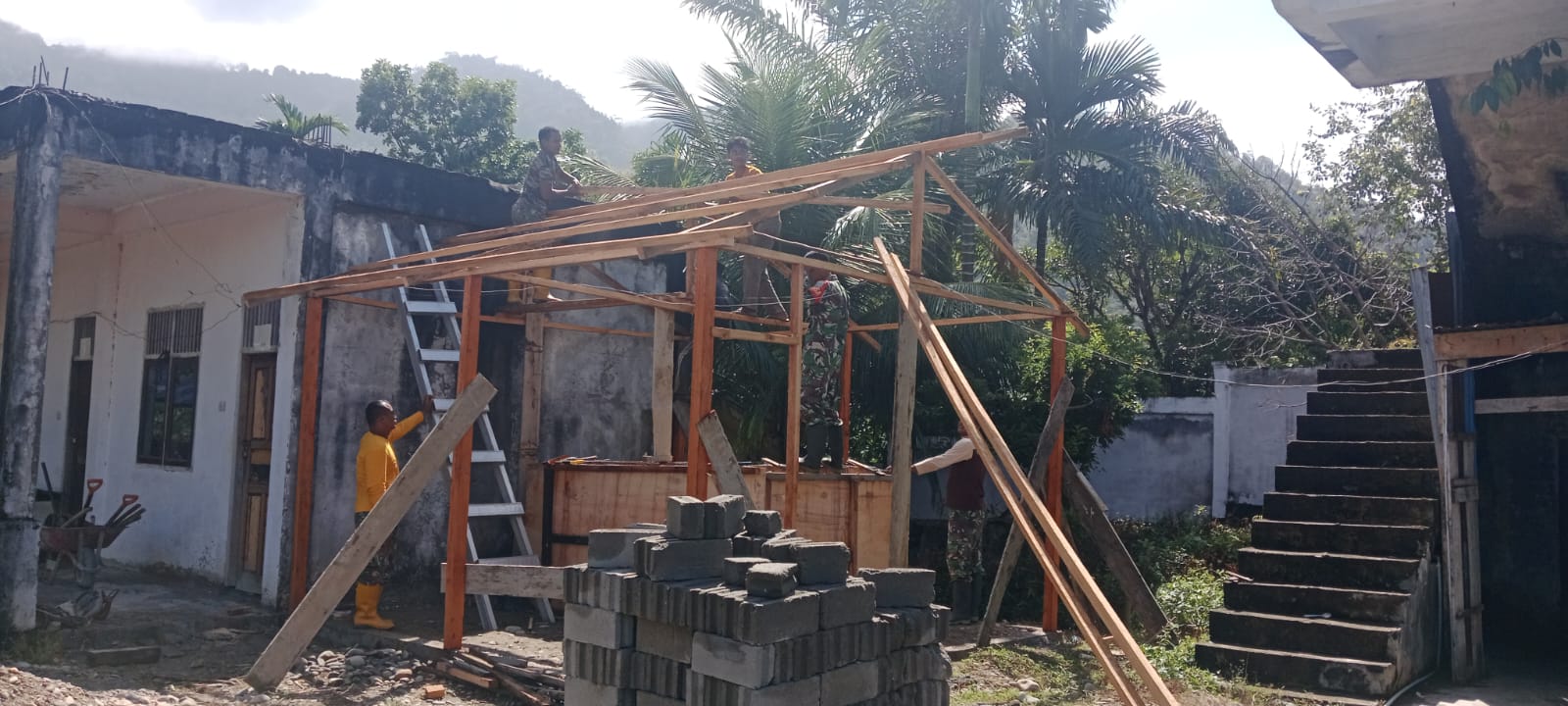 Tampak personel Babinsa dan masyarakat bahu-membahu membangun fasilitas tempat wudhu di salah satu Pondok Pasantren (Ponpes) yang ada di Desa Pucuk Kreung.
