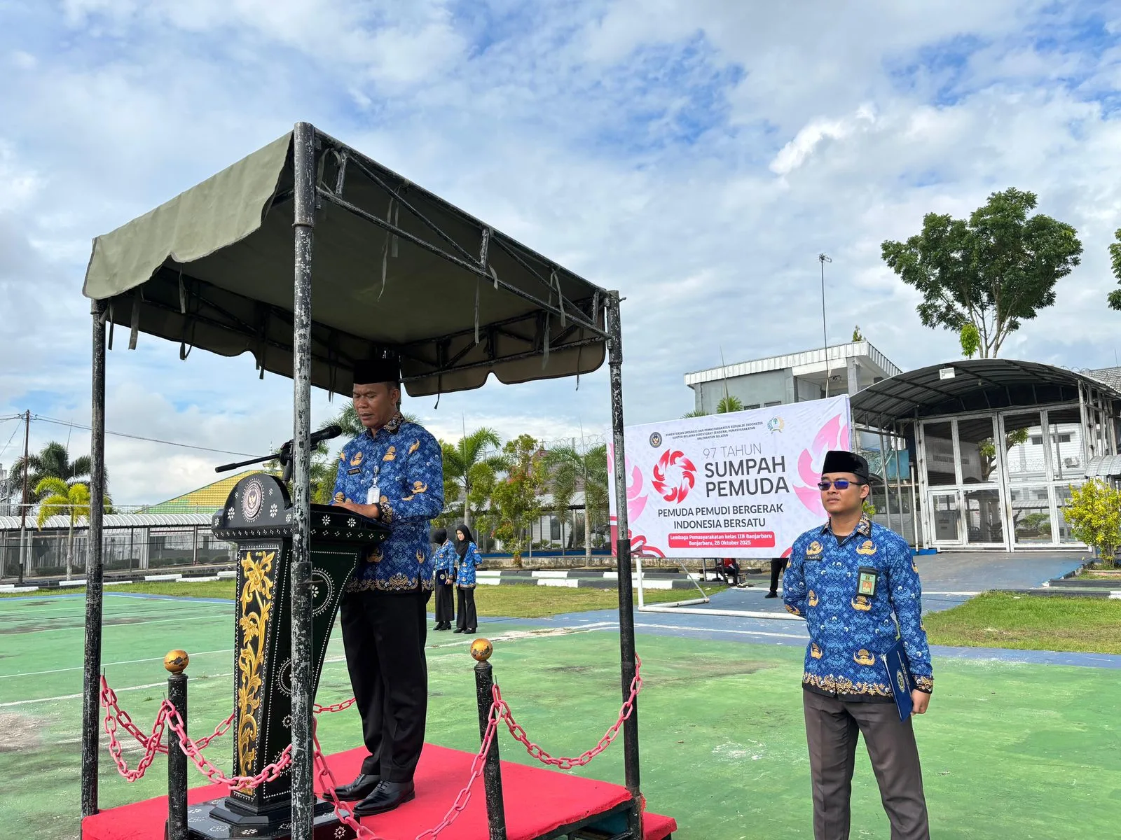 Banjarbaru, INFO_PAS – Lembaga Pemasyarakatan (Lapas) Kelas IIB Banjarbaru gelar upacara peringatan Hari Sumpah Pemuda ke-97 Tahun 2025 yang berlangsung di Lapangan Lapas Banjarbaru, Selasa (28/10). Kegiatan diikuti oleh para pejabat struktural, para pegawai, dan perwakilan Warga Binaan sebanyak 100 orang yang turut berpartisipasi dengan penuh semangat.