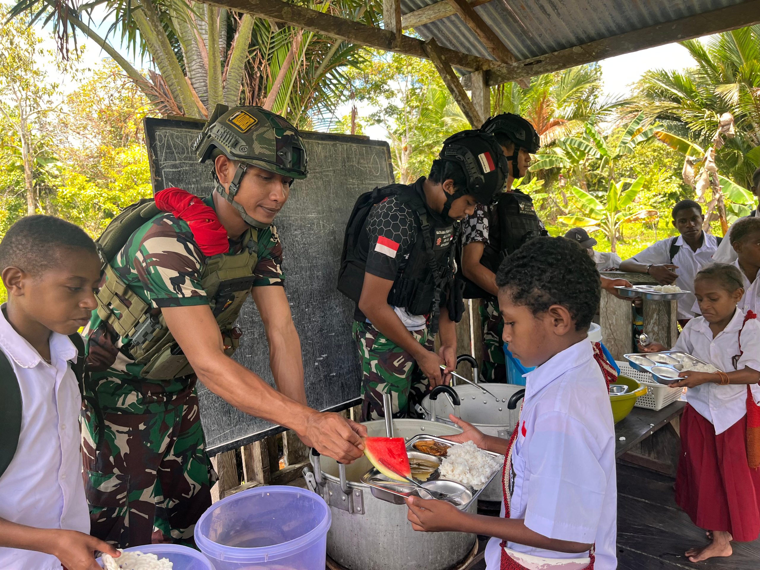 Papua, 29 September 2025 – Keceriaan terpancar dari wajah siswa-siswi Sekolah Dasar (SD) Rimba YPPK Yan Smith Mumugu saat menerima makanan bergizi gratis dari Prajurit Satgas Pamtas RI-PNG Mobile Yonif 733/Masariku. Kegiatan ini merupakan bagian dari program “Masariku Peduli Gizi” yang bertujuan untuk meningkatkan kesehatan dan kesejahteraan anak-anak di wilayah perbatasan.