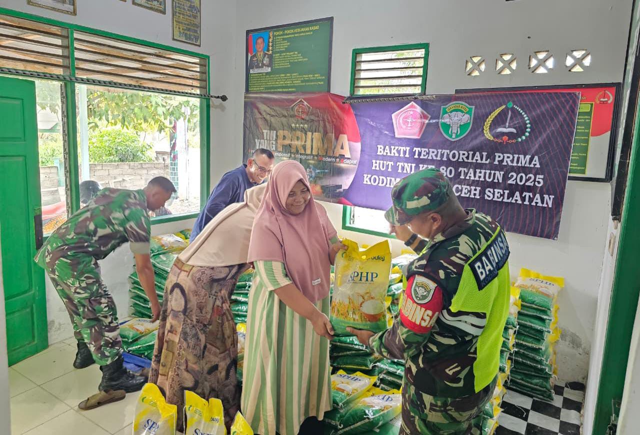 ACEH SELATAN – Dalam rangka menyambut Hari Ulang Tahun ke-80 Tentara Nasional Indonesia (TNI), Kodim 0107/Aceh Selatan menggelar Serbuan Bhakti Teritorial PRIMA dengan berbagai kegiatan sosial yang menyentuh langsung masyarakat. Salah satu kegiatan yakni Gerakan Pangan Murah yang terlaksana melalui kerja sama dengan Perum Bulog dan Pemerintah Daerah Aceh Selatan, Jumat (12/9/2025).