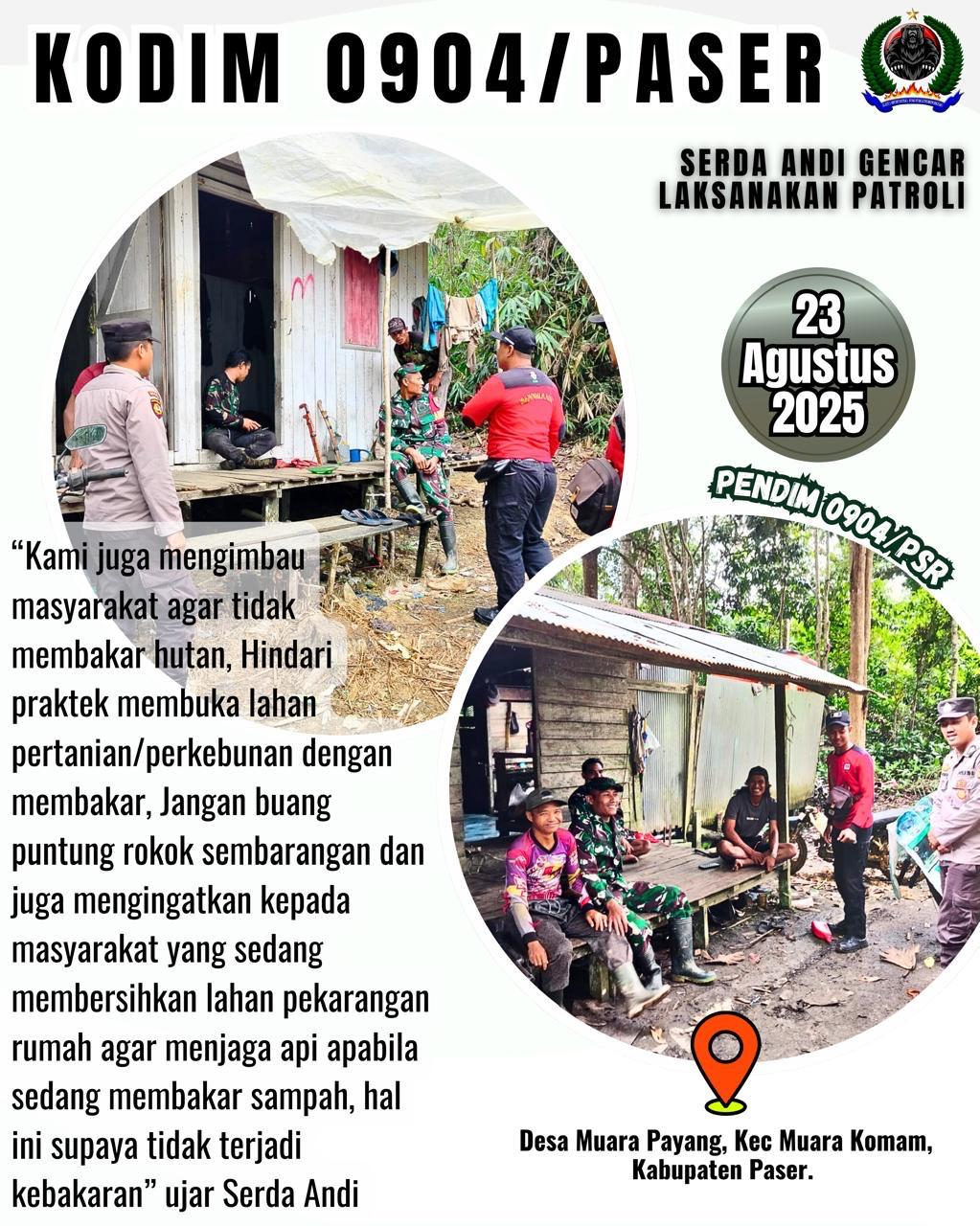 Babinsa Koramil 0904-07/Mkm Serda Andi bersama Manggala Akni, Polsek Muara Komam dan Masyarakat Peduli Api melaksanakan patroli Terpadu serta memberi Sosialisasi/penyuluhan tentang pencegahan Karhutla kepada masyarakat di Desa Muara Payang Kec. Muara Komam.