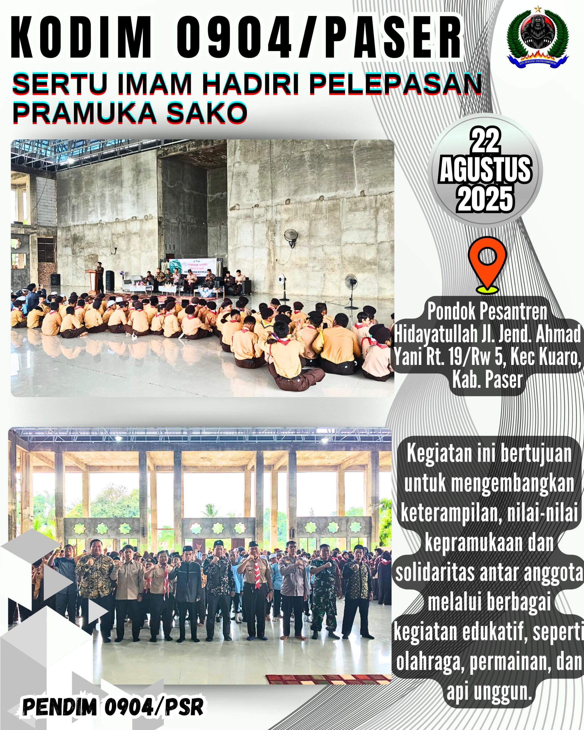 Kodim 0904/Psr, Korem 091/ASN, Kodam VI/Mlw. Babinsa Koramil 0904-05/Kuaro Sertu Imam Purwanto menghadiri kegiatan pelepasan Kontingen Pramuka Satuan Komunikasi (Sako) Hidayatullah Paser bertempat di Pondok Pesantren Hidayatullah Jl. Jend. Ahmad Yani Rt 19/Rw 5, Kec. Kuaro, Kab. Paser, Jumat (22/8/2025)