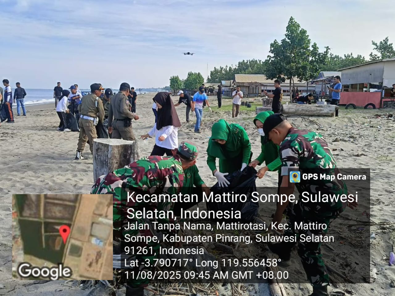 Pinrang_ Sinergitas 3 pilar yakni Babinsa Jajaran Koramil-02/Mattiro Sompe Kodim 1404/Pinrang, Bhabinkamtibmas jajaran Polsek Mattiro Sompe, Staf Kecamatan dan Desa serta masyarakat melaksanakan kegiatan pelestarian alam dengan melakukan pembersihan pantai wisata Ammani di Desa Mattiro Tasi Kecamatan Mattiro Sompe Kabupaten Pinrang, Senin (11/08/2025).