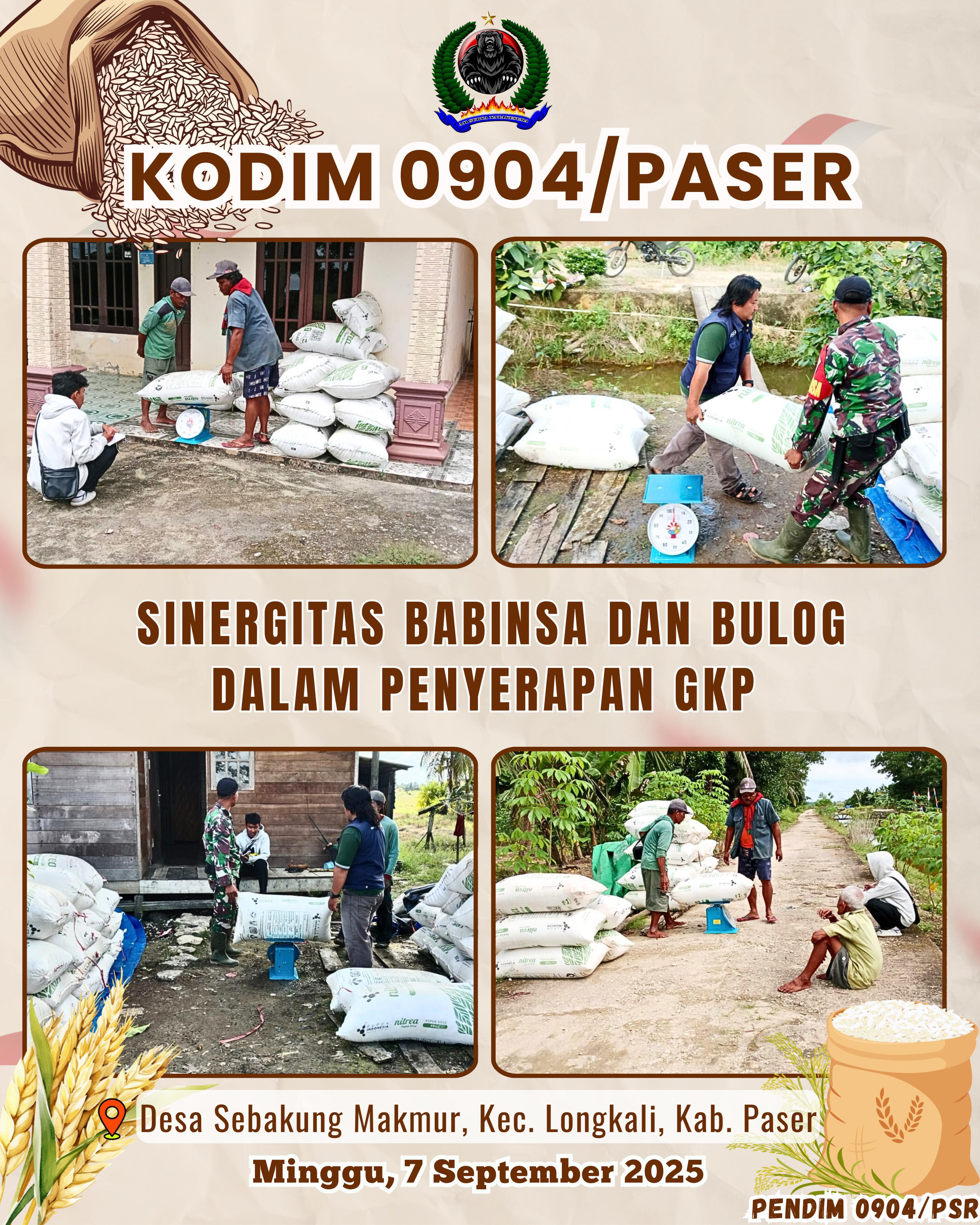 Kodim 0904/Psr, Korem 091/ASN, Kodam VI/Mlw – Babinsa Sebakung Makmur melaksanakan Pendampingan Petugas Bulog dalam Penimbangan dan Penyerapan GKP (Gabah Kering Panen) Petani BP Desa Sebakung Makmur, Minggu (7/9/2025).