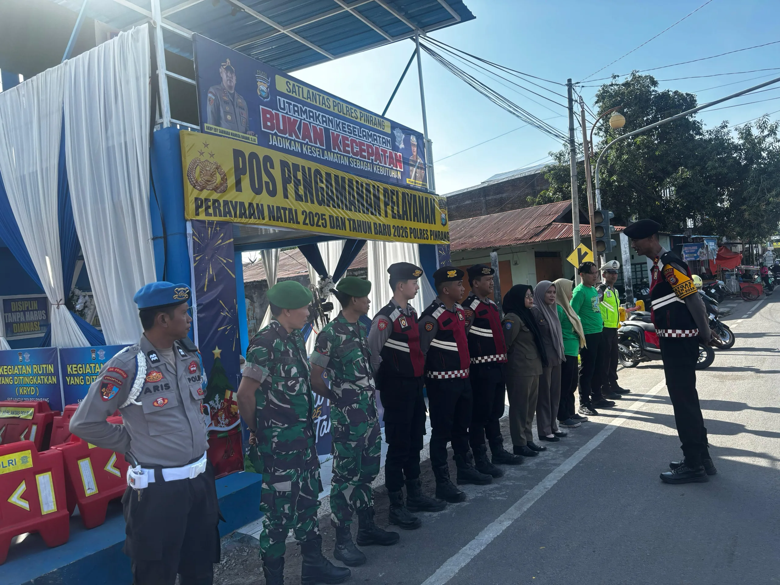 Pinrang_ Dalam rangka menjaga situasi keamanan dan ketertiban masyarakat selama perayaan Natal dan Tahun Baru (Nataru), sinergitas TNI–Polri bersama stakeholder terkait terus ditingkatkan melalui pengamanan di Pos Pengamanan (Pospam) Nataru yang tersebar di wilayah Kabupaten Pinrang, Jum’at (26/12/2025).