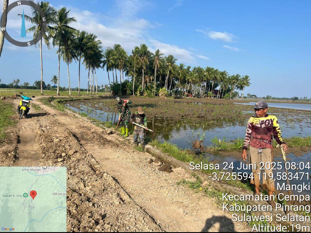 Pinrang_ Demi membantu kelancaran dalam pengolahan lahan pertanian serta mendukung kebutuhan air persawahan petani, Babinsa Koramil-06/Duampanua Kodim 1404/Pinrang Serma Risal bersama warga melaksanakan kerja bakti membersihkan saluran irigasi di Dusun Linoe Desa Mangki Kecamatan Cempa Kabupaten Pinrang, (25/06/2025).