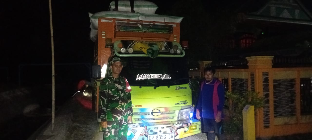 Pinrang_ Sampai malam hari, Babinsa Koramil-03/Mattiro Bulu Kodim 1404/Pinrang Sertu Tamrin terus memberikan dukungan dan pendampingan kepada petani dalam proses serapan gabah hasil panen petani oleh Bulog dengan harga Rp 6.500 perkilogram di Desa Bunga Kecamatan Mattiro Bulu Kabupaten Pinrang, Sabtu (10/05/2025).