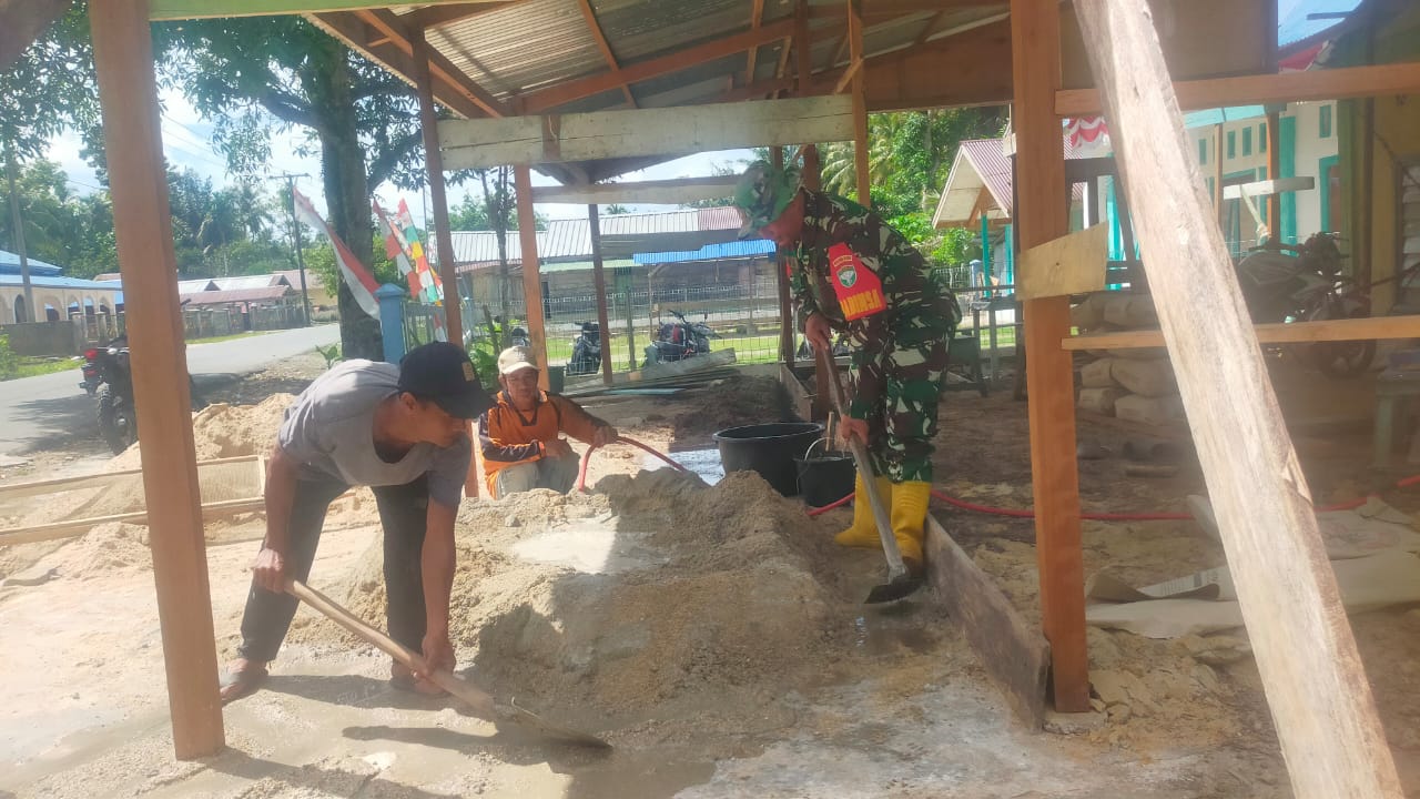 Simeulue – Babinsa Koramil 04/Salang Kopka Subana melaksanakan kegiatan membantu warga membangun rumah Di Desa Tameng, Kecamatan Salang, Kabupaten Simeulue. Senin(25/08/2025).