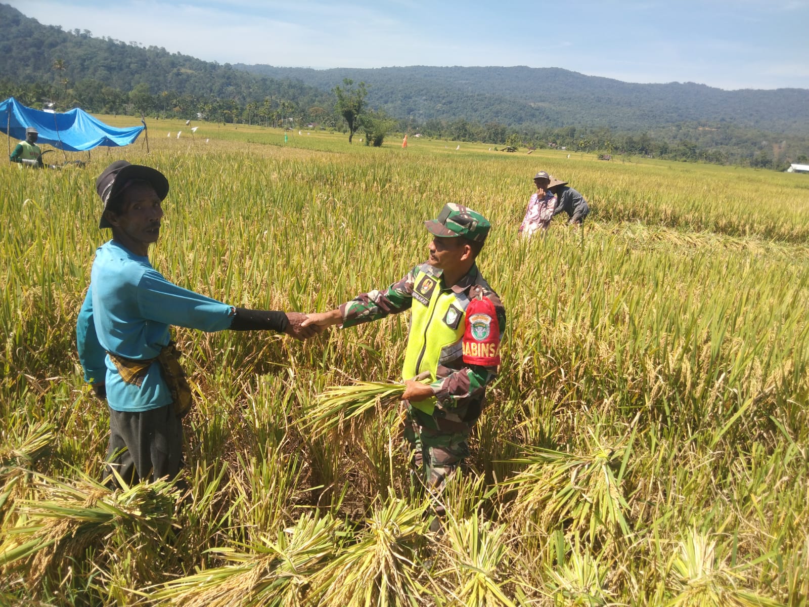Bersama Jamaluddin dan petani lainnya, Serma Abu Bakar memotong padi secara tradisional menggunakan sabit.