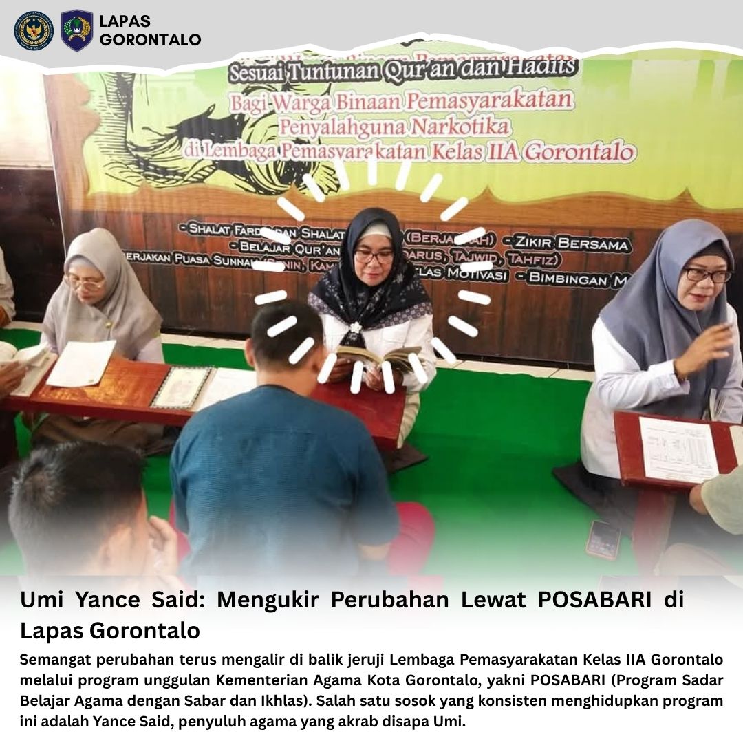 Gorontalo – INFO_PAS – Semangat perubahan terus mengalir di balik jeruji Lembaga Pemasyarakatan Kelas IIA Gorontalo melalui program unggulan Kementerian Agama Kota Gorontalo, yakni POSABARI (Program Sadar Belajar Agama dengan Sabar dan Ikhlas). Salah satu sosok yang konsisten menghidupkan program ini adalah Yance Said, penyuluh agama yang akrab disapa Umi.