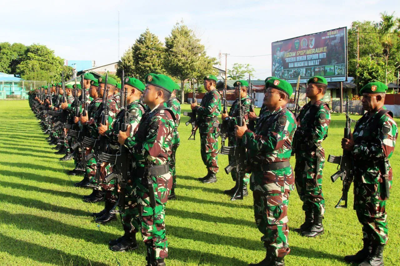 Merauke – Semangat nasionalisme dan cinta tanah air kembali bergema di Lapangan Upacara Makodim 1707/Merauke Jln. Raya Mandala, Kota Merauke, Kabupaten Merauke – Provinsi Papua Selatan. Pada Senin pagi (5/1/2026) pukul 07.00 WIT, ratusan prajurit TNI dari Korem 174/ATW dan Kodim 1707/Merauke dengan khidmat mengikuti Upacara Bendera Mingguan.