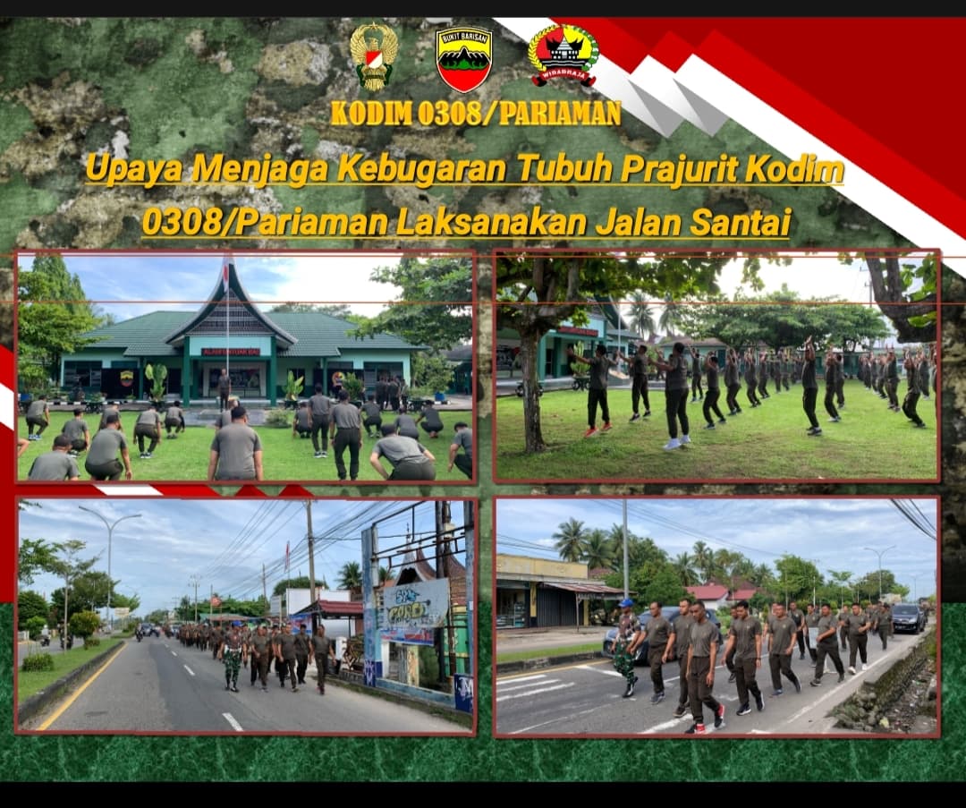 PARIAMAN, – Dalam upaya menjaga dan meningkatkan kebugaran tubuh, Prajurit Kodim 0308/Pariaman melaksanakan jalan santai bersama di Kodim 0308/Pariaman Jl.Toboh Palabah, Pariaman Timur, Kota Pariaman, Jum’at (02/05/2025).