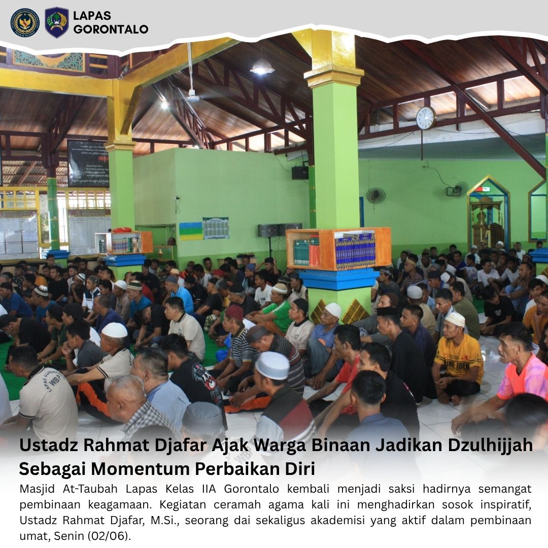 Gorontalo – INFO_PAS – Masjid At-Taubah Lapas Kelas IIA Gorontalo kembali menjadi saksi hadirnya semangat pembinaan keagamaan. Kegiatan ceramah agama kali ini menghadirkan sosok inspiratif, Ustadz Rahmat Djafar, M.Si., seorang dai sekaligus akademisi yang aktif dalam pembinaan umat, Senin (02/06).