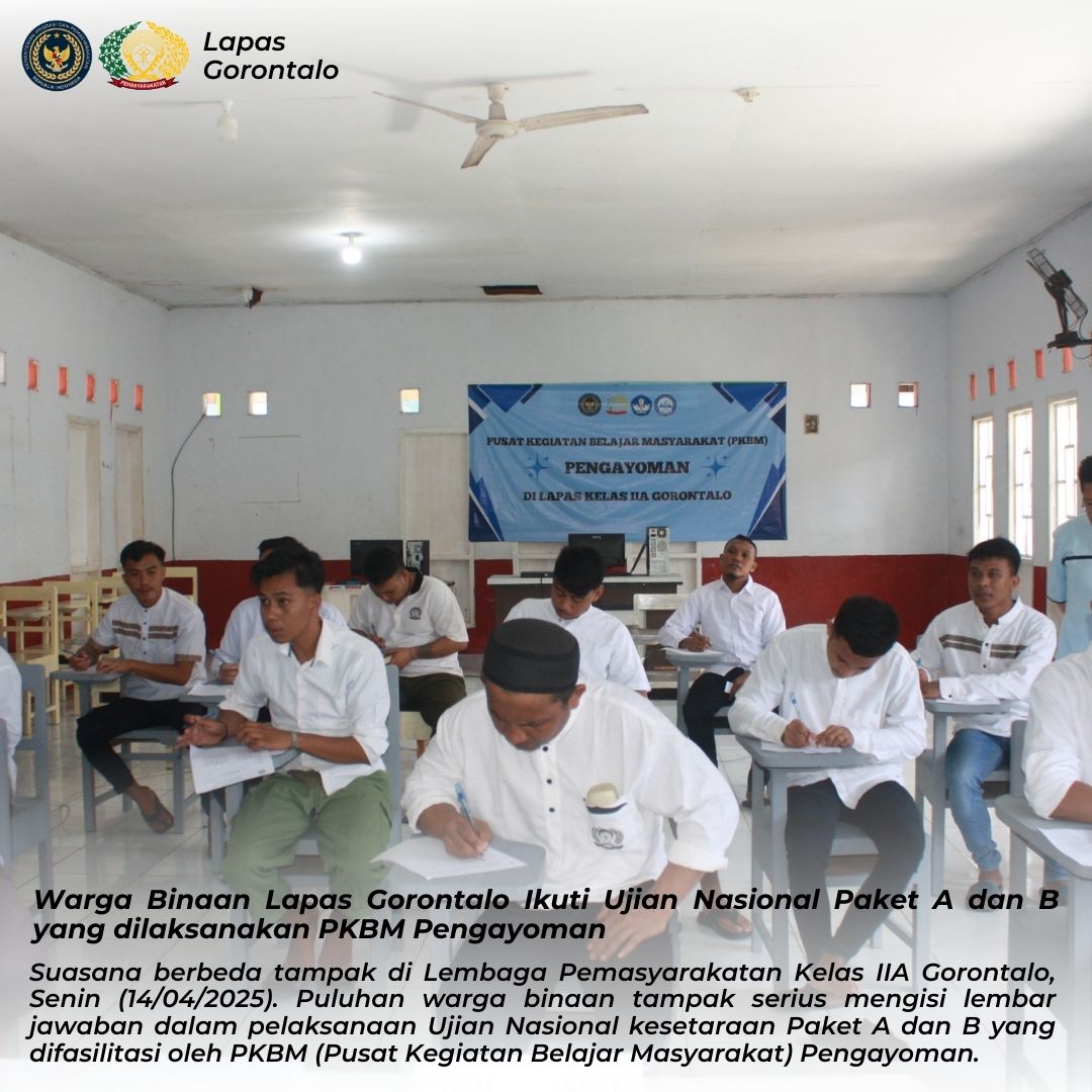 Gorontalo – Suasana berbeda tampak di Lembaga Pemasyarakatan Kelas IIA Gorontalo, Senin (14/04/2025). Puluhan warga binaan tampak serius mengisi lembar jawaban dalam pelaksanaan Ujian Nasional kesetaraan Paket A dan B yang difasilitasi oleh PKBM (Pusat Kegiatan Belajar Masyarakat) Pengayoman.