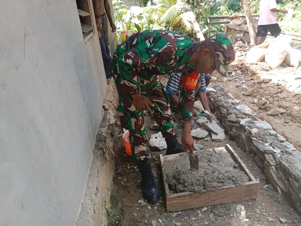 Sementara itu  Danramil 1703-02/Tigi Kapten Inf Sudarno Di sisi lain selalu mengingatkan kepada anggota Babinsa nya bahwa membantu warga binaan merupakan tugas pokok  Babinsa membantu masyarakat yang membutuhkan bantuan. Ikut bergotong royong membantu warga binaan yang sedang melaksanakan pembangunan pondasi rumahnya.
