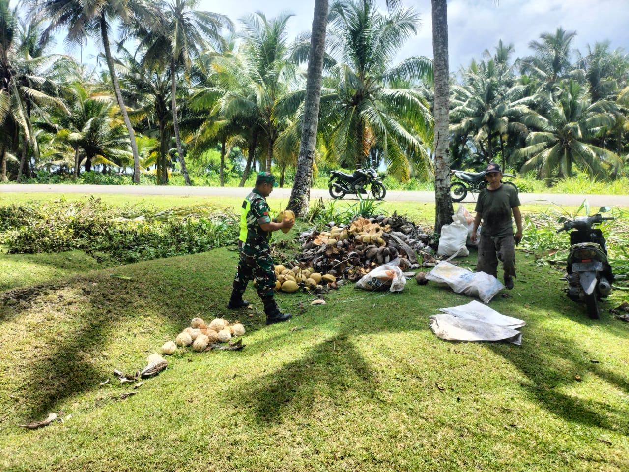Simeulue – Babinsa Koramil 03/Teupah Selatan Kodim 0115/Sml membantu Bapak Usman mengupas kelapa yang baru saja dipanen bertempat di Desa Trans Baru Kecamatan Teupah Selatan kabupaten Simeulue Sabtu (09/06/2025).