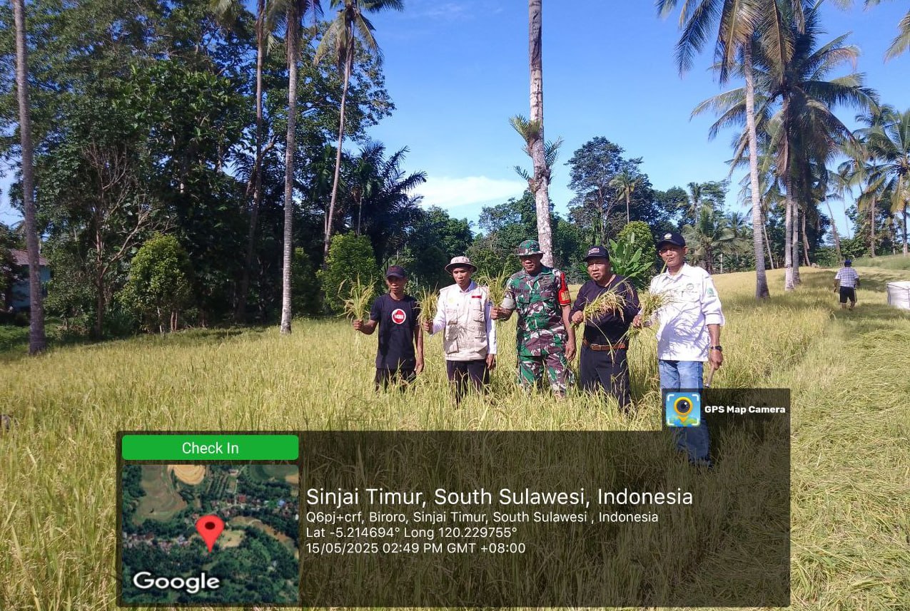SINJAI – Dalam rangka mendukung program ketahanan pangan nasional, Babinsa Desa Biroro Koramil 1424-04/Sinjai Timur, Serka Rustan, turut serta mendampingi proses panen padi di lahan pertanian milik warga setempat. Kegiatan ini dilaksanakan di Dusun Bentengnge, Desa Biroro, Kecamatan Sinjai Timur, Kabupaten Sinjai, pada lahan seluas 1 hektare milik Bapak Faisal, anggota Kelompok Tani Bentengnge.