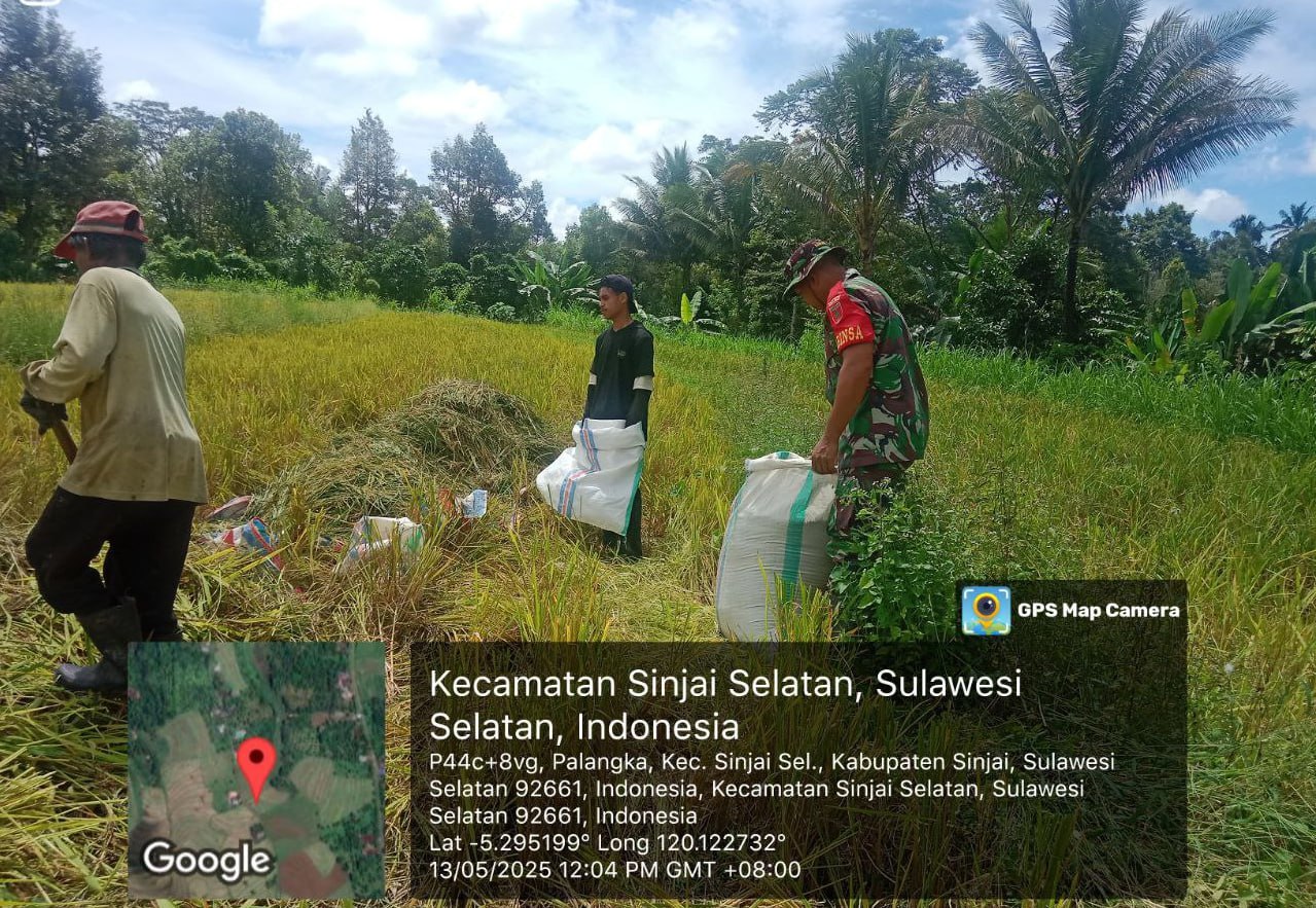 Sinjai – Babinsa Desa Palangka Koramil 1424-05/Sinjai Selatan, Serda Asri Majid, menunjukkan komitmennya dalam mendukung ketahanan pangan melalui kegiatan pemantauan dan pendampingan panen padi di wilayah binaannya. Kegiatan ini dilaksanakan di lahan seluas 0,50 hektar milik Bapak Bahri, anggota Kelompok Tani Buhung Lembang Keke, yang berlokasi di Dusun Honto, Desa Palangka, Kecamatan Sinjai Selatan, Kabupaten Sinjai, Selasa (13/05/2025)