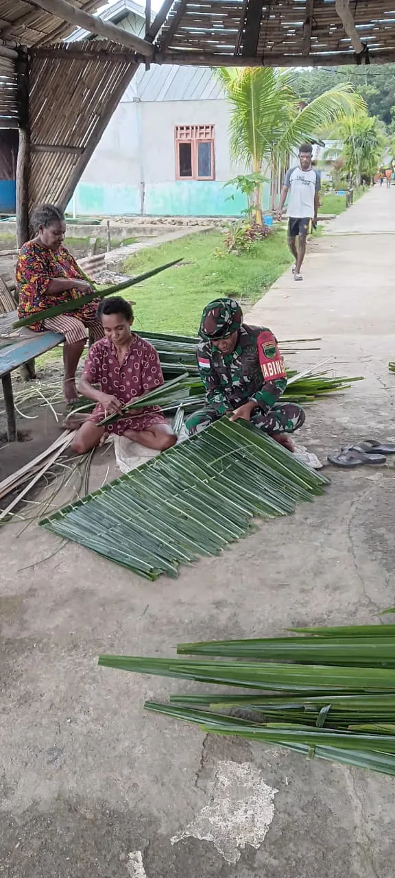 Raja Ampat,PBD– Babinsa Posramil 1805- 04/Misiol, Serda Syarudhin Nussy melaksanakan anjangsana dan sekalian komunikasi sosial (komsos) bersama warga binaannya saat sedang menganyam atap dari daun sagu, di Kampung, Lilinta Distrik Missol kab.Raja Ampat, ,Selasa (30/09/2025).